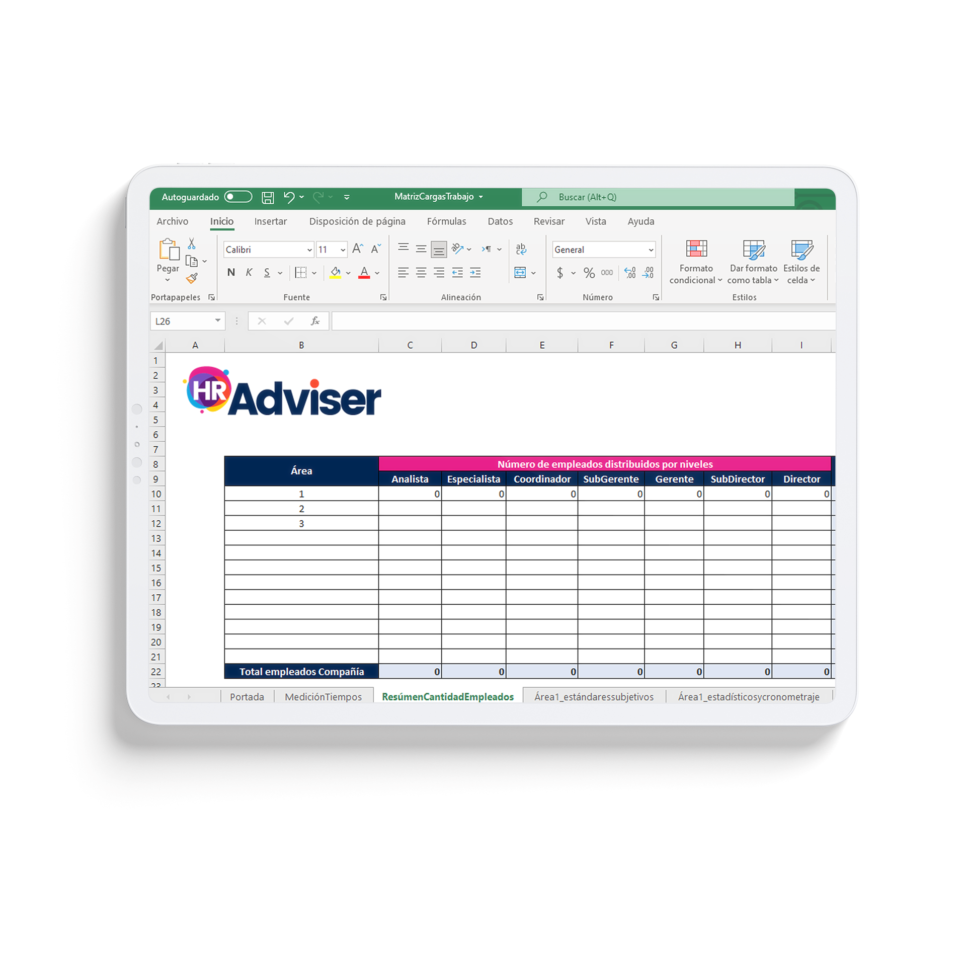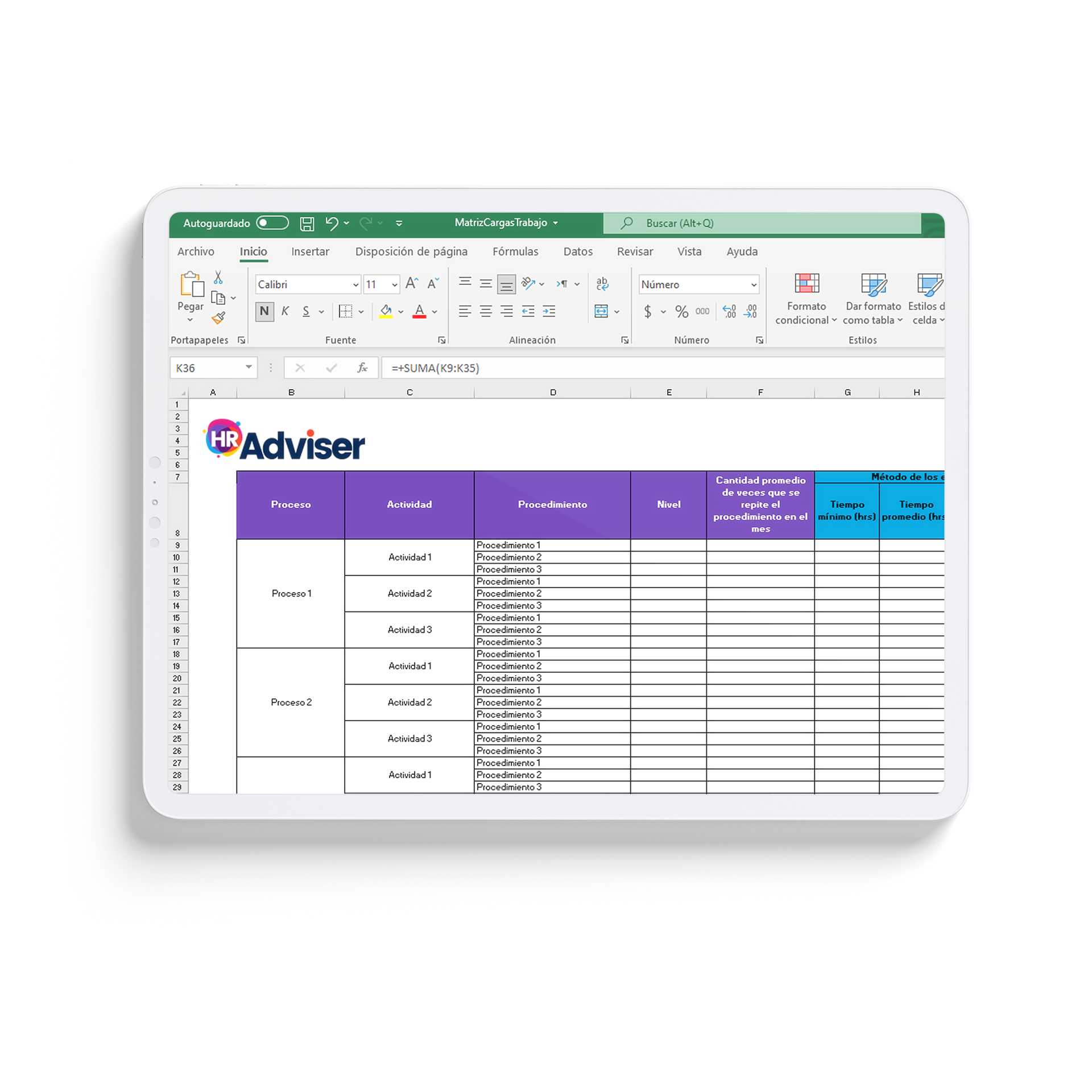 Utiliza esta matriz 100% editable y formulada para dimensionar la cantidad de personal que necesitas utilizando el método de los estándares subjetivos (establece el tiempo estándar de una actividad con base en estimaciones de tiempos realizados por personas que tienen un buen conocimiento de ellas) o el método del cronometraje (establece el tiempo estándar de una actividad midiendo, con cronometro, el tiempo que un empleado experimentado y trabajando a ritmo normal tardar en realizarla).