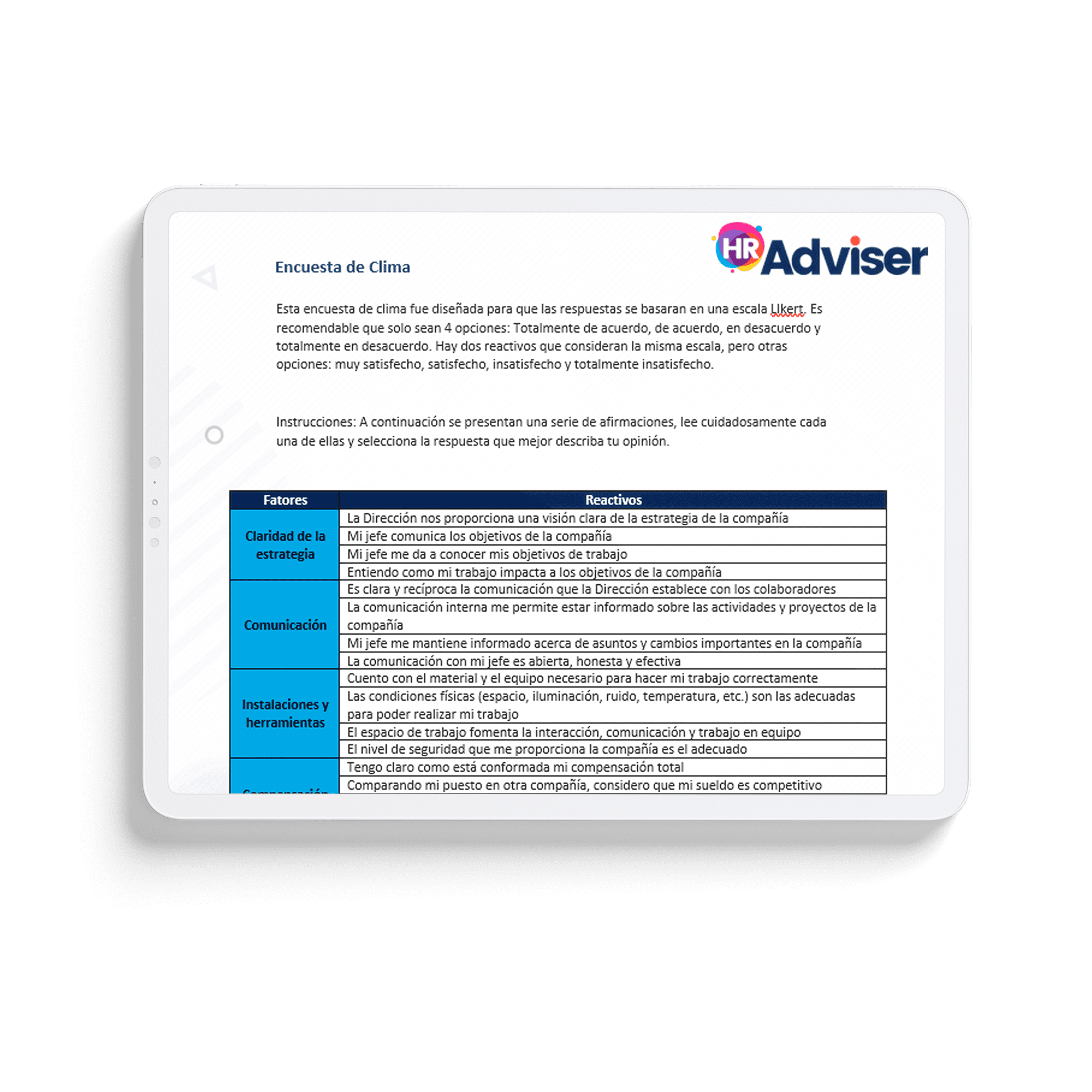 Esta encuesta te permite medir, a través de 44 reactivos, los siguientes factores: Claridad de la estrategia, Comunicación, Instalaciones y herramientas, compensación, motivación por el trabajo, mejor opción laboral, balance vida-trabajo, desarrollo y crecimiento profesional, liderazgo gerencial, reconocimiento, cooperación y trabajo en equipo; también, contiene 2 reactivos abiertos y 5 reactivos demográficos.