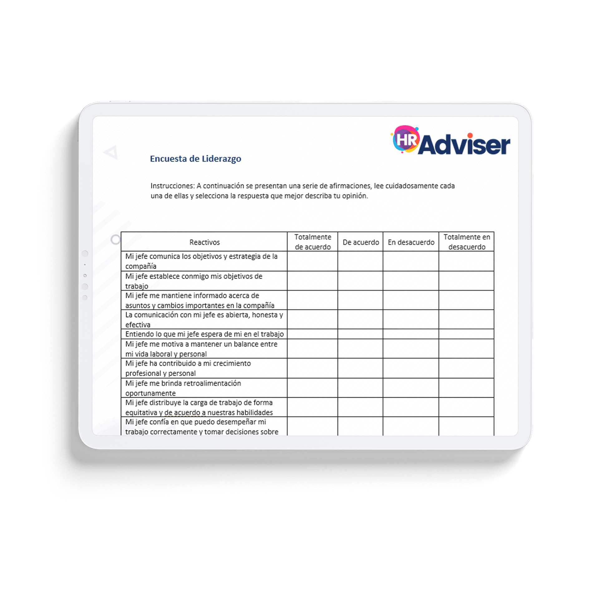 Está encuesta de liderazgo está conformada por 12 reactivos, a través de los cuales, se evalúan aspectos como: la información que comparte el jefe con respecto a la situación de la empresa, si contribuye al desarrollo profesional y personal de sus subordinados, si confía en ellos y los mantiene motivados o si reconoce su trabajo.