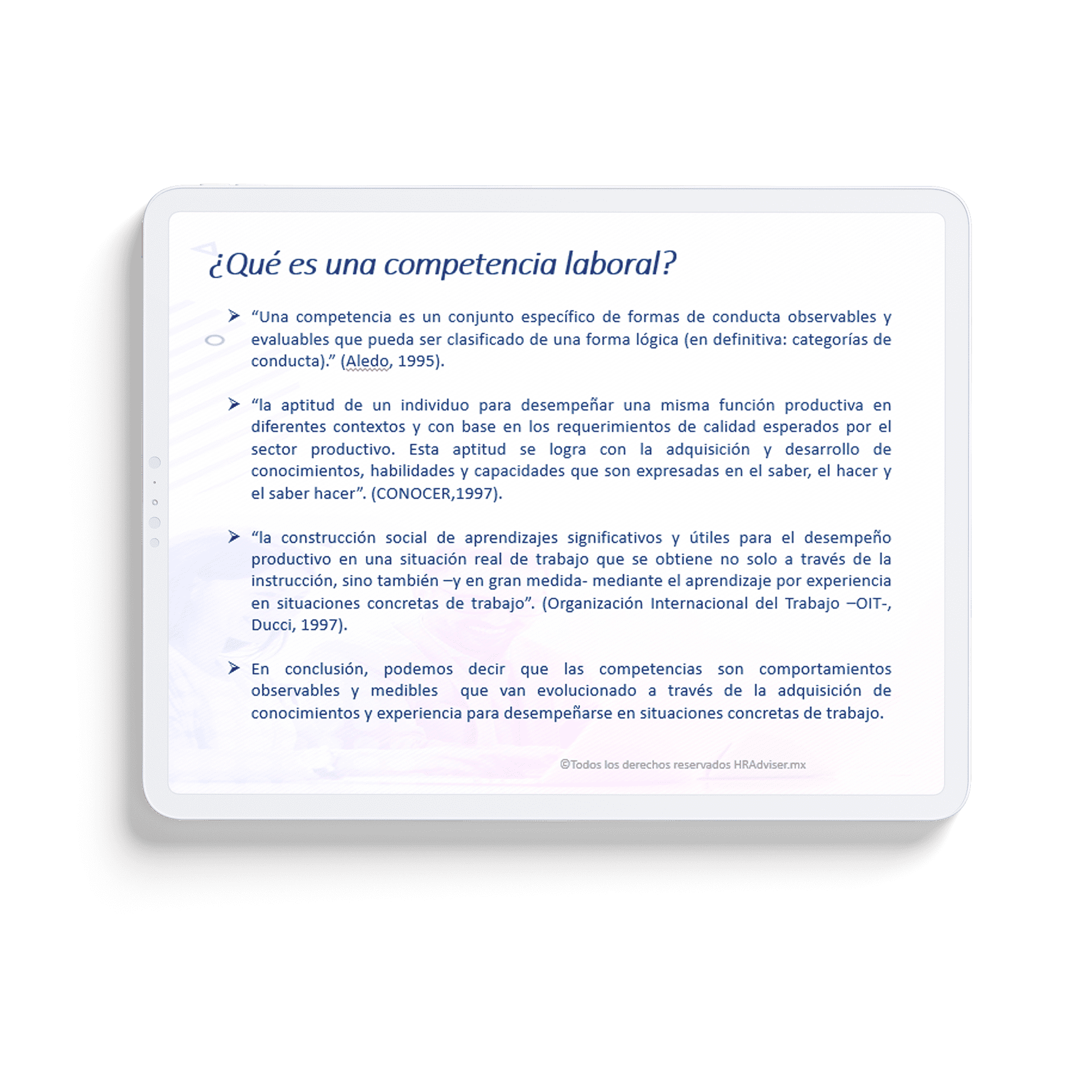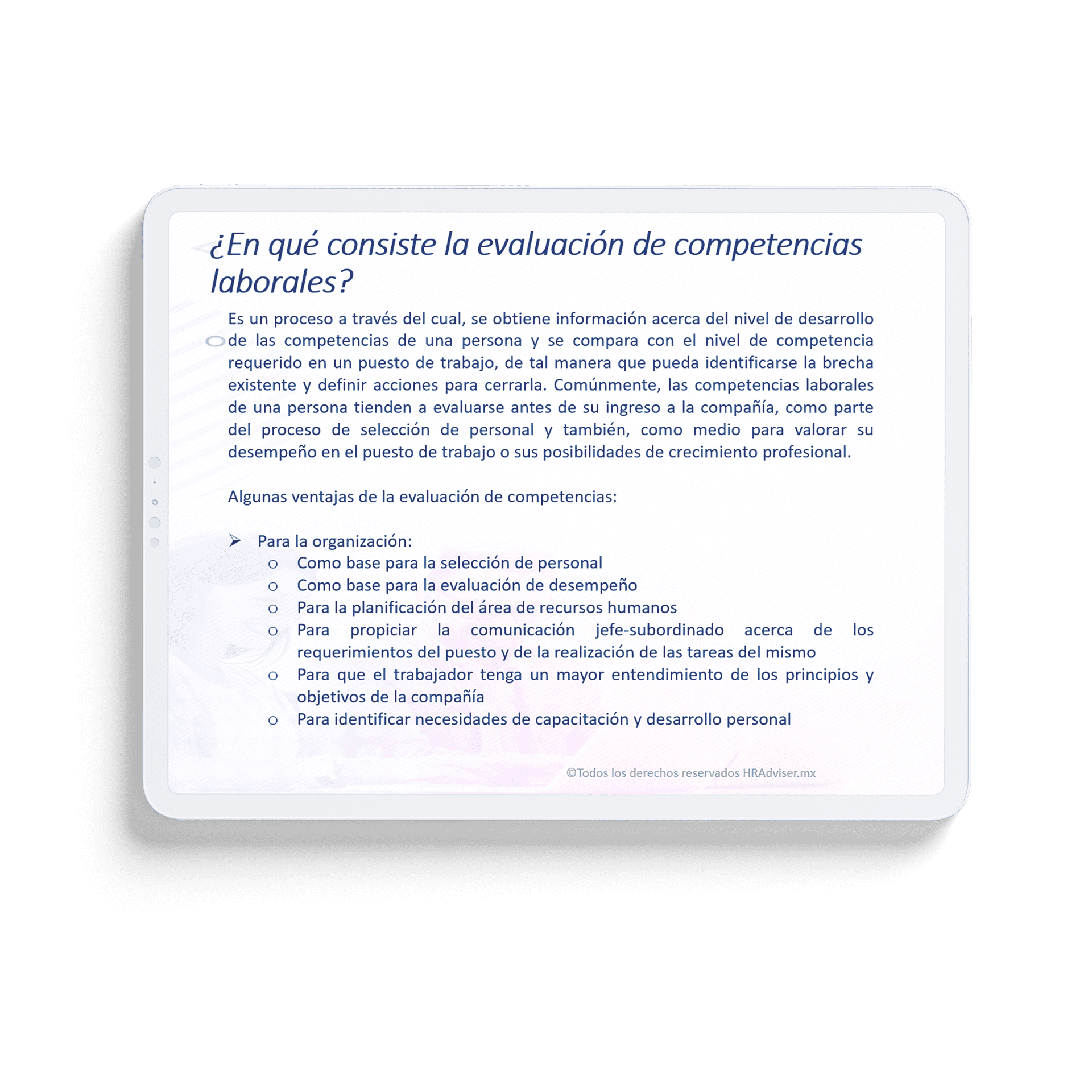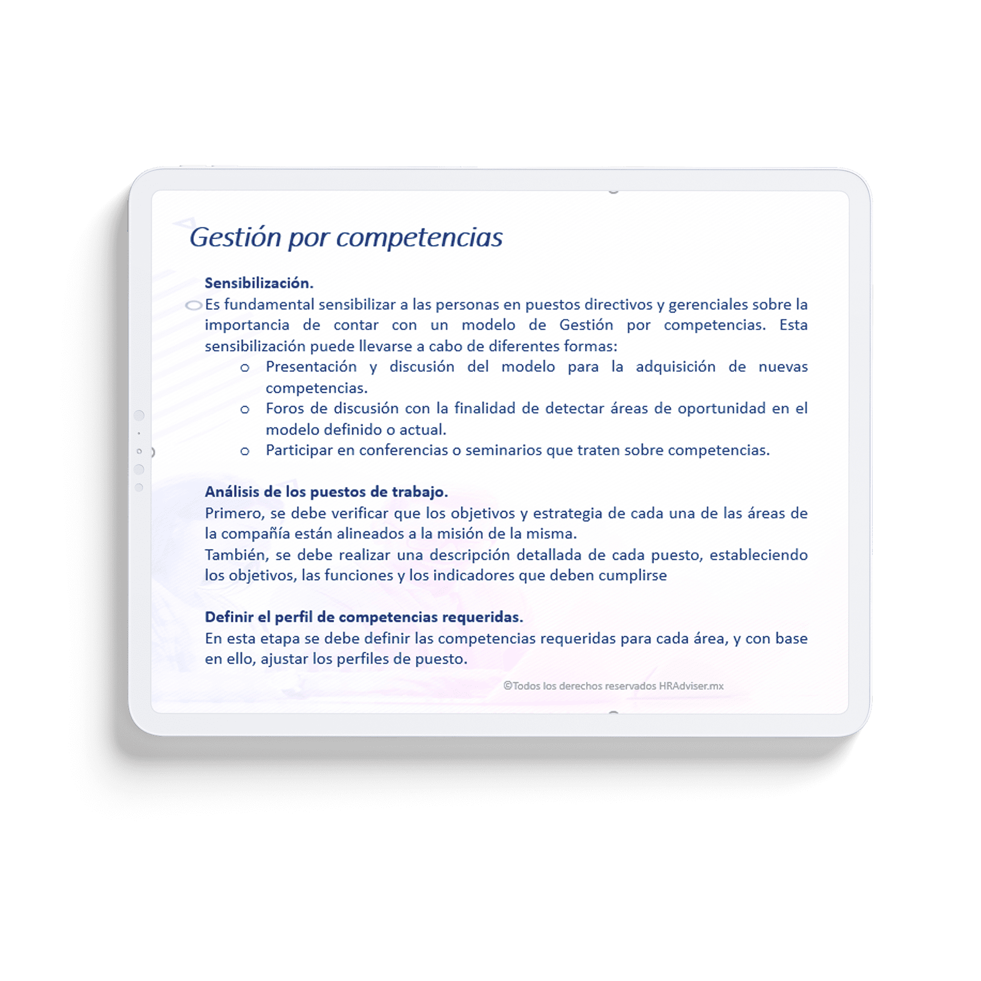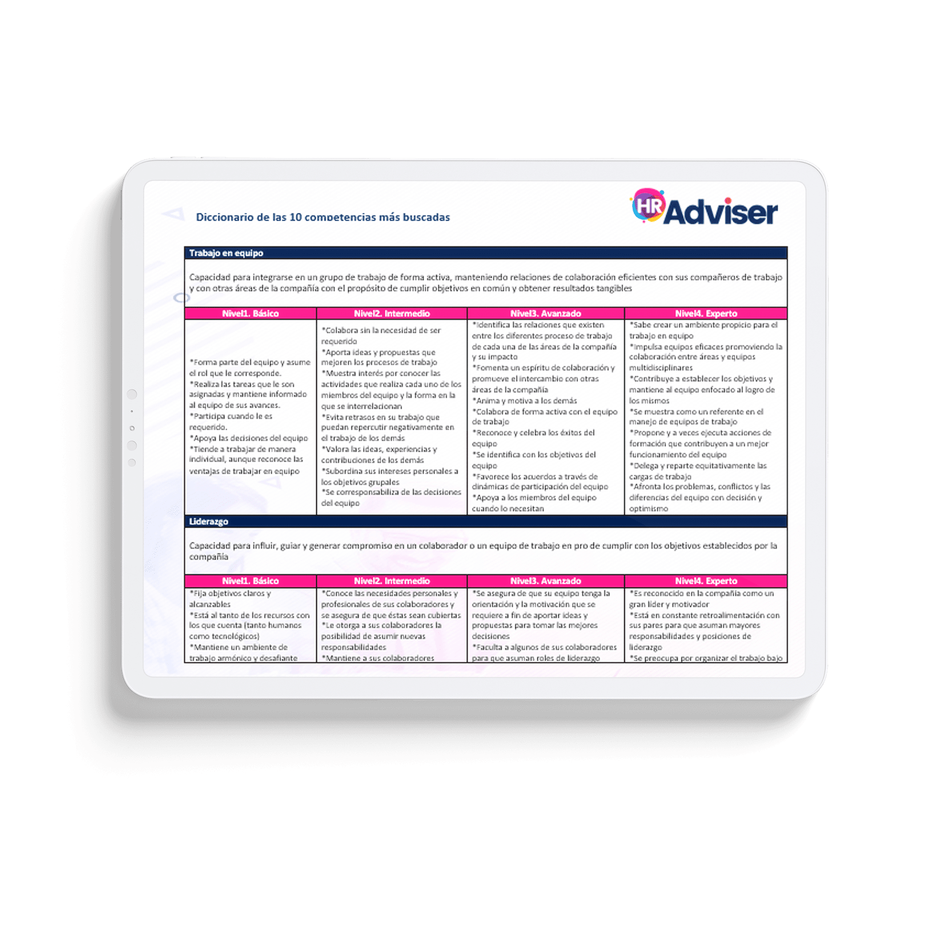 –Diccionario de competencias. Este diccionario cuenta con las 10 competencias más buscadas en el mercado como inteligencia emocional o trabaja en equipo. Cada competencia ha sido desarrollada, por lo que cuentas con su definición y respectivos niveles de dominio.